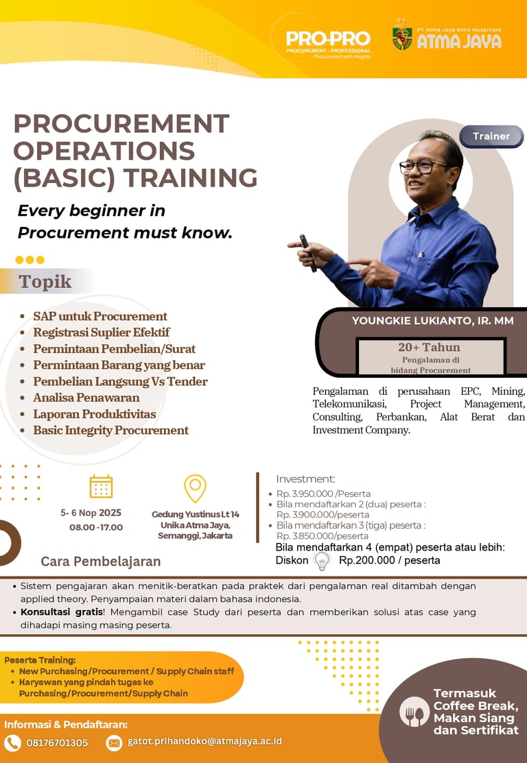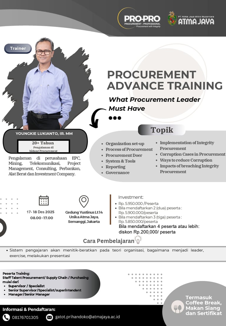 Pro-Pro adalah penyedia layanan konsultan procurement dengan spesialisasi pembekalan individu dan organisasi berupa pengetahuan dan keterampilan yang dibutuhkan untuk mengelola proses procurement secara efektif. Dengan komitmen kami terhadap procurement yang berintegritas sebagai inti misi kami dalam memberdayakan individu dan organisasi untuk melakukannya secara etis (terutama dalam mencegah korupsi) dan secara efektif memberikan peluang yang sama untuk meraih kesuksesan dan kesejahteraan,